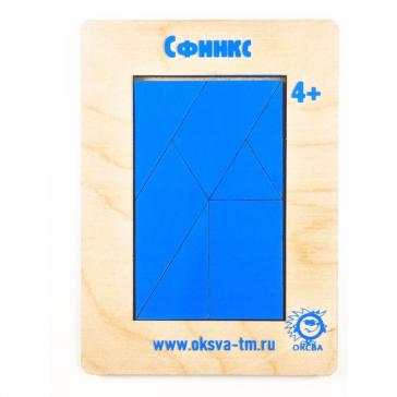 Головоломка "Сфинкс" представляет собой планшет размером А6, вкладыш-прямоугольник, поделенный на 7 геометрических фигур (прямоугольник - 1шт., треугольник - 4 шт., трапеция - 2 шт.), окрашенный с двух сторон в одинаковый цвет, и методические рекомендации по использованию игрового материала. Головоломка относится ко 2-му уровню сложности.