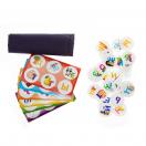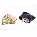 Состав игры: • картонные карточки – 6 шт. (14,5 х 9 см). • фишки пластмассовые – 36 шт. (диаметр – 4 см, толщина – 0,3 см). • мешочек из ткани для фишек – 1 шт. (30 х 18 см).